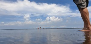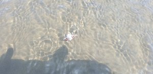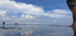 木棧道到底後,脫掉鞋襪,涉水踩上粼粼映射陽光的微溫。海天連色,維持著客隊一貫的好運,陽光很客氣的給點小顏色瞧,我們當然不客氣看個過癮。