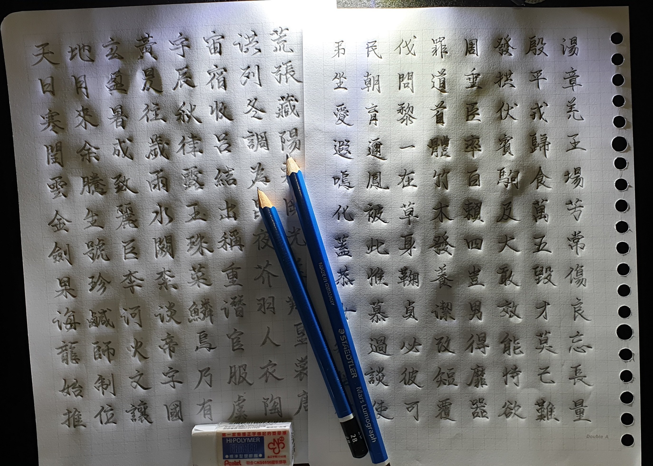 2020.09.27. 3*3 鉛筆練字 分類:K L2020-10-02發表於筆尖生活標籤:DoubleA A5活頁紙,德國施德樓鉛筆4B 2×2的小字寫習慣了,3×3的大字也要練了。小字太習慣,轉練大字,大小很難控制,看來格子紙還得再用好長一段時間… 2×2適合用2B鉛筆或0.5、0.7原子筆3×3適合用4B鉛筆或1.0原子筆 分享此文: 分享到 X(在新視窗中開啟) X 分享到 Facebook(在新視窗中開啟) Facebook 喜歡 正在載入... 相關