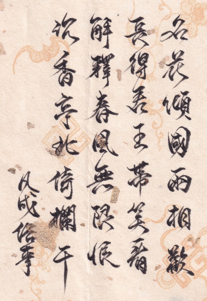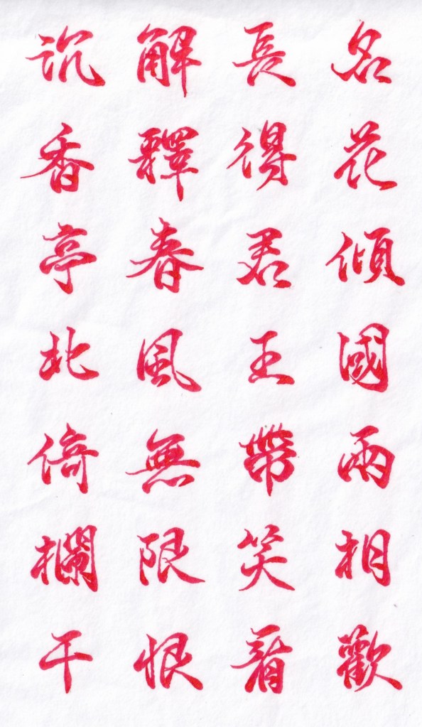以嬌豔名花與貴妃傾國之姿並論,引出玄宗帶笑望之,沉香亭當時的情景,便在首兩句完整呈現。「相歡」與「帶笑」更是把輕鬆歡愉氣氛點綴而出。更為下句「解釋春風無限恨」做了舖陳。