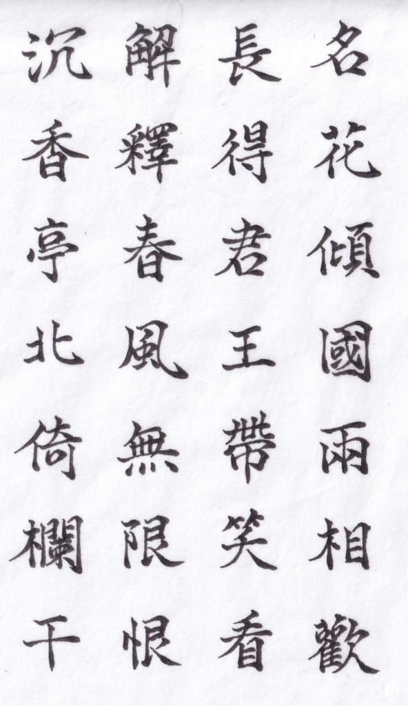 李白奉命寫下清平調,前兩首自然是盛讚景美、人更美。而這首,卻是把沉香亭北畔的情景刻劃如實。詩中,只見玄宗倚著欄杆,望著嬌豔牡丹花與傾國姿色楊貴妃,兩相輝映,更是令人賞心悅目。國事纏身的玄宗,原本心中帶了不少愁緒,剎時間便消散而去。